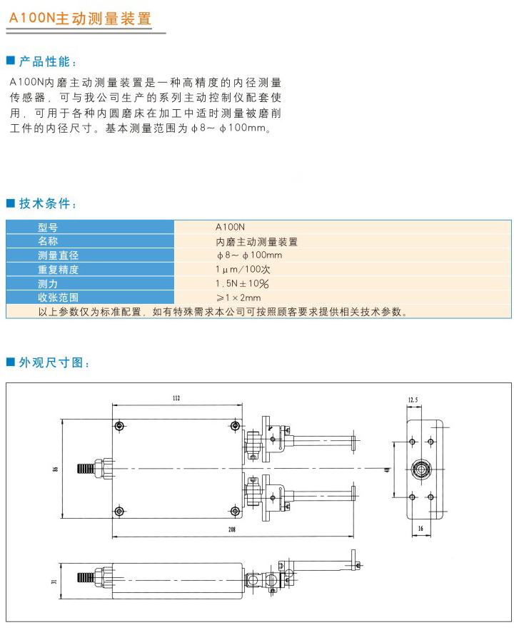 A100N內(nèi)磨主動(dòng)測(cè)量裝置,是我公司生產(chǎn)的一種高精度內(nèi)徑測(cè)量傳感器,可與我公司生產(chǎn)的系列主動(dòng)控制一配套使用 可用于各種內(nèi)圓磨床在加工中適時(shí)測(cè)量被磨削工件的內(nèi)徑尺寸。基本測(cè)量范圍為φ8-φ100mm