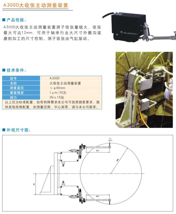 A300D大收張單點(diǎn)主動(dòng)測(cè)量裝置。可用于外圓、內(nèi)孔、端面、平面等各種場(chǎng)合。